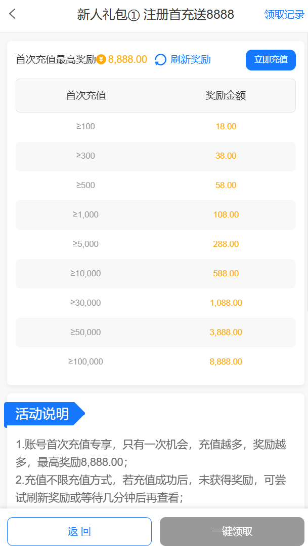 首存活动:100+18/300+38+500+58/1000+108/1倍流水/