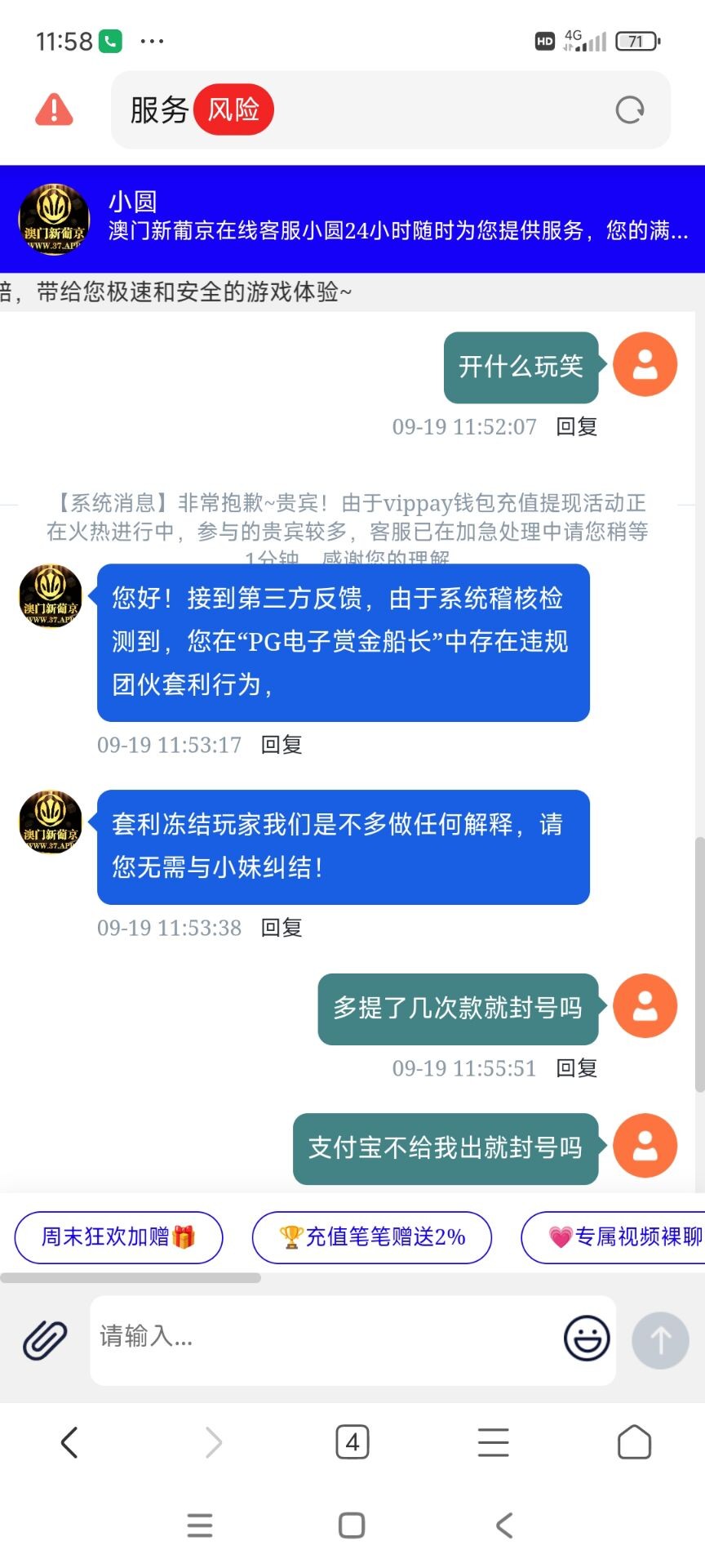 代码只能玩电子pg和wg电子玩其他的打够100再充值100自己玩其他的被黑自己负责