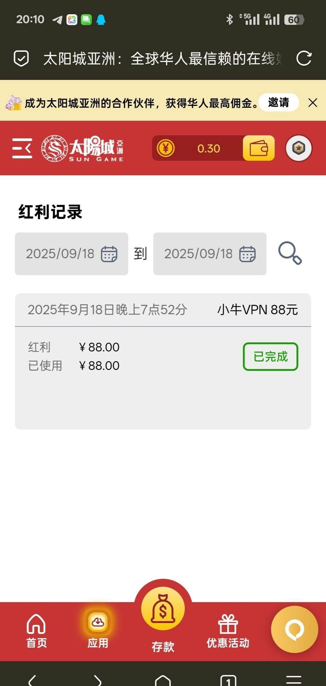 小牛VPN联手太阳城送88彩金 不需要开会员